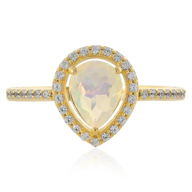 Entdecken Sie die schillernde Anziehungskraft dieses äthiopischen Welo-Opal-Rings. Der tränenförmige Edelstein ist in exquisites 925er vergoldetes Silber gefasst und mit 36 funkelnden kambodschanischen Zirkonen von insgesamt 0,428 ct. geschmückt. Das 2,76 g schwere Band hebt das Farbenspiel des opulenten Opals von 0,793 ct hervor und macht jede Geste zu einem schimmernden Statement. Dieser Ring ist ideal, um jedem Outfit einen Hauch von Eleganz zu verleihen, und eignet sich sowohl für besondere Anlässe als auch für den täglichen Luxus.