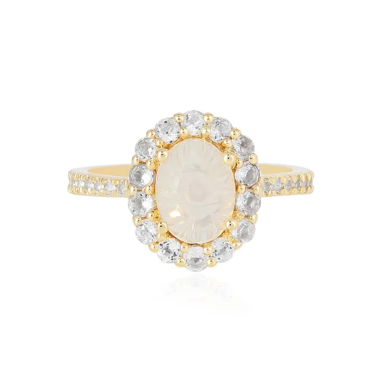 Entdecken Sie das faszinierende Farbenspiel dieses exquisiten Rings aus vergoldetem 925er Sterling Silber. Er präsentiert einen atemberaubenden ovalen Welo-Opal im Phantasieschliff, umgeben von funkelnden weißen Topasen aus Madagaskar. Das unverwechselbare Muster des Opals, kombiniert mit dem Funkeln von 32 Topasen im Rundschliff, ergibt ein Gesamtgewicht von 1,41 Karat. Ob als raffinierte Ergänzung für den Alltag oder als i-Tüpfelchen für einen festlichen Anlass – dieser Ring wird Ihren Stil mühelos ergänzen.