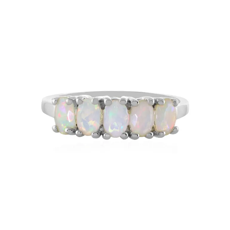 Entdecken Sie das bezaubernde Farbenspiel dieses majestätischen Rings aus äthiopischem Welo-Opal. Der aus 925er Sterlingsilber gefertigte Ring zeigt eine Reihe von fünf Opalen im Ovalschliff mit einem Gesamtkaratgewicht von 1,373, von denen jeder in einem irisierenden Lichtspiel schimmert. Die subtile Eleganz der Silberfassung unterstreicht die natürliche Schönheit der Opale und macht dieses Schmuckstück zu einer vielseitigen Ergänzung für jedes Outfit. Ideal für das tägliche Tragen oder besondere Anlässe, verspricht es ein Gesprächsanlass zu sein.