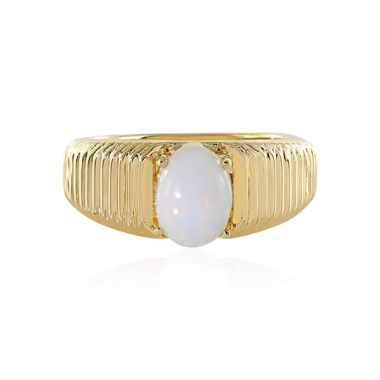 Entdecken Sie die Faszination des äthiopischen Welo-Opals in diesem fein gearbeiteten Ring. Ein schimmernder Opal-Cabochon von 0,71 Karat steht im Mittelpunkt, eingefasst in ein Band aus 925er Sterlingsilber, das für einen zusätzlichen Hauch von Eleganz vergoldet ist. Der schillernde Edelstein wird durch die goldenen Farbtöne des Bandes wunderbar ergänzt und macht ihn zu einem vielseitigen Schmuckstück für jede Gelegenheit. Ob für eine formelle Veranstaltung oder im Alltag, dieser opulente Ring verleiht Ihrer Garderobe einen Hauch von Raffinesse.
