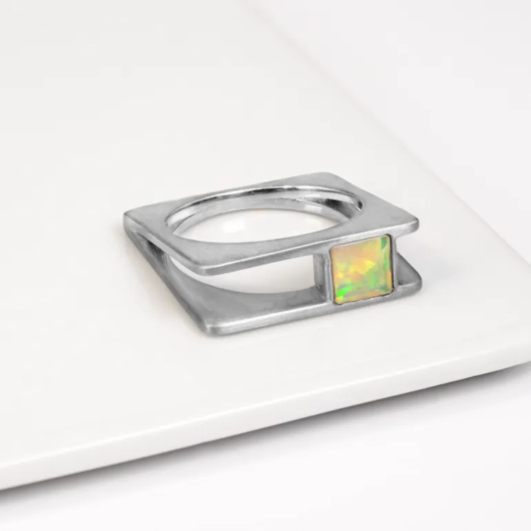 Entdecken Sie die faszinierende Anziehungskraft dieses äthiopischen Welo-Opalrings, der mit seinem geometrischen Design einen modernen Charme versprüht. Der mit Präzision gefertigte Opal von 0,399 Karat ist in ein hochwertiges Band aus 925er Sterlingsilber gefasst und mit einer Platinbeschichtung versehen, die für Haltbarkeit und Glanz sorgt. Der schlichte, quadratische Schliff des Opals verleiht klassischer Eleganz eine moderne Note und macht ihn zu einem idealen Accessoire für Ihre Geschäftskleidung oder zu einer dezenten Note für Ihre Abendgarderobe. Dieser Ring aus der MONOSONO COLLECTION ist ein Statement-Stück, das alle Blicke auf sich zieht und für Gesprächsstoff sorgt.