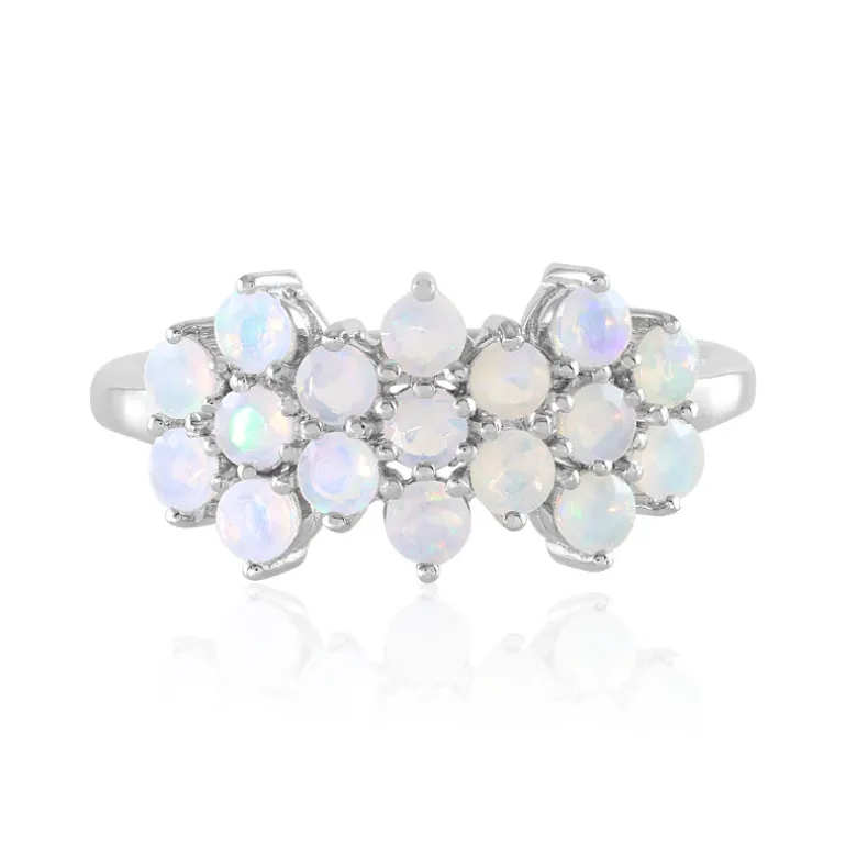 Entdecken Sie das faszinierende Farbenspiel dieses luxuriösen Rings mit siebzehn äthiopischen Welo-Opalen im Rundschliff von insgesamt 1,068 Karat, elegant gefasst in platiniertem 925er Sterlingsilber. Mit einer Größe von 22×20 mm fängt dieser Ring die ätherische Schönheit der Opale ein. Jeder Edelstein reflektiert zart ein Regenbogenspektrum, das aus jedem Winkel funkelt. Dieser Opalring eignet sich sowohl für lässige Eleganz als auch für glamouröse Abende und ist eine vielseitige Ergänzung für jede Schmucksammlung, die Ihnen einen Hauch von Raffinesse für jeden Anlass verleiht.