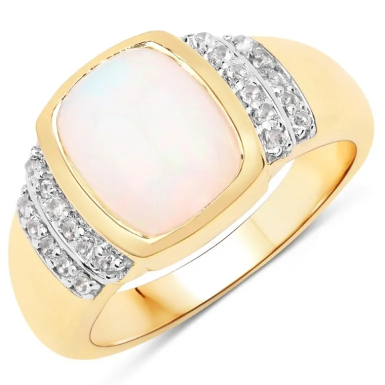 Dieser exquisite Ring besticht durch einen äthiopischen Welo-Opal von 1,62 Karat, dessen Farbtöne bei jeder Bewegung schimmern. Eingerahmt von 22 strahlenden indischen Weißtopasen von insgesamt 0,198 ct. sitzt der Opal im Vintage-Cabochon-Schliff prominent auf einem 925er Sterlingsilberband mit Goldauflage. Mit einem Gewicht von ca. 5,21 g verbindet dieses Schmuckstück antiken Charme mit moderner Eleganz und eignet sich perfekt, um der Alltagskleidung einen Hauch von Luxus zu verleihen oder einen Akzent für besondere Anlässe zu setzen.