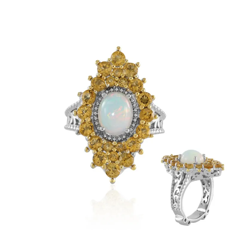 Entdecken Sie die Faszination des äthiopischen Schatzes mit diesem atemberaubenden Ring, einem Meisterwerk von Dallas Prince Designs. Ein ovaler Welo-Opal im Cabochon-Schliff mit einem Gewicht von 1,047 ct erstrahlt in einem schillernden Farbenspiel, umrahmt von einem Kranz funkelnder Zitrine im Rundschliff mit einem Gesamtgewicht von 1,695 ct aus Brasilien. Das Design ist in 925er Sterlingsilber mit einem eleganten Platin-Finish verankert und wiegt ca. 7,98 g. Dieses bezaubernde Schmuckstück mit den Maßen 27 x 23 mm ist ein Fest der Eleganz und eignet sich perfekt für formelle Anlässe oder als raffinierter Begleiter im Alltag.