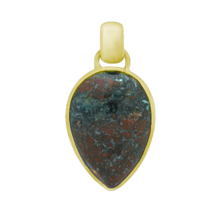Entdecken Sie die Anziehungskraft dieses exquisiten Anhängers, der einen fesselnden 22-karätigen russischen Zarinit in einem tropfenförmigen Cabochon-Schliff zeigt, der in glänzendes vergoldetes 925er Sterlingsilber gehüllt ist. Der Anhänger strahlt Raffinesse aus und misst 35×18,5 mm mit einer beträchtlichen Edelsteinpräsenz von etwa 25×17 mm. Dieses Schmuckstück ist sowohl für den eleganten Tag als auch für den glamourösen Abend geeignet und verspricht eine vielseitige Ergänzung Ihrer Schmucksammlung zu werden. Kombinieren Sie es mit einer klassischen Bluse für einen Hauch von Eleganz am Tag oder mit einem eleganten Abendkleid für einen exquisiten Abend.