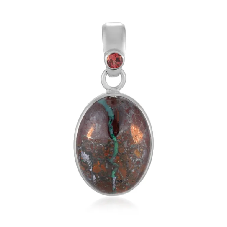 Entdecken Sie die Anziehungskraft Russlands mit diesem fesselnden ovalen Zarinit-Cabochon-Anhänger, der durch einen feurigen AAA-Granat aus Mosambik ergänzt wird. Der aus hochwertigem 925er Sterlingsilber mit Platin-Finish gefertigte Anhänger präsentiert einen 13,6-karätigen Zarinit in einem eleganten Silberrahmen, der von einem 0,25-karätigen runden Brillantgranat akzentuiert wird. Mit seinen Maßen von 34 x 16 mm und seiner einzigartigen Palette an Erdtönen ist er ideal, um sowohl Tages- als auch Abendgarderobe aufzuwerten. Ein Schatz, der das Herz von anspruchsvollem Stil und zeitloser Eleganz berührt.