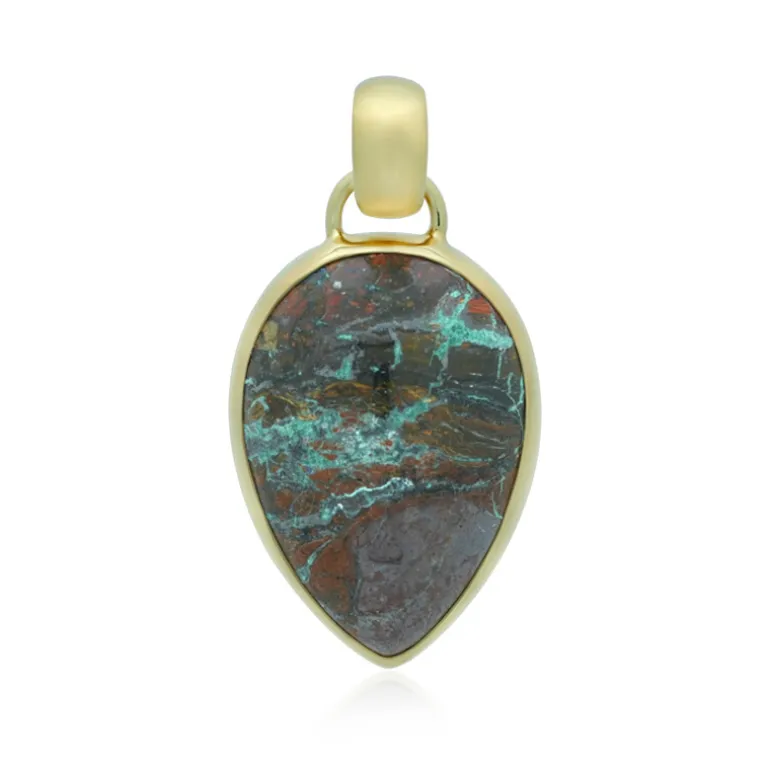 Entdecken Sie die faszinierende Anziehungskraft dieses tränenförmigen Zarinit-Anhängers. Gefertigt aus 925er Sterlingsilber mit einer exquisiten Goldplattierung, wiegt dieses Stück etwa 3,5 g und verfügt über einen atemberaubenden 22-karätigen russischen Zarinit-Cabochon, der etwa 24 x 16 mm groß ist. Das einzigartige Muster und die leuchtenden Farben des Anhängers ziehen das Auge in ihren Bann und machen ihn zu einer vielseitigen Ergänzung sowohl für Tages- als auch für Abendgarderobe. Ein Schatz, der die Mystik russischer Edelsteine heraufbeschwört und eine anspruchsvolle Wahl für Sammler und Modefans gleichermaßen ist.