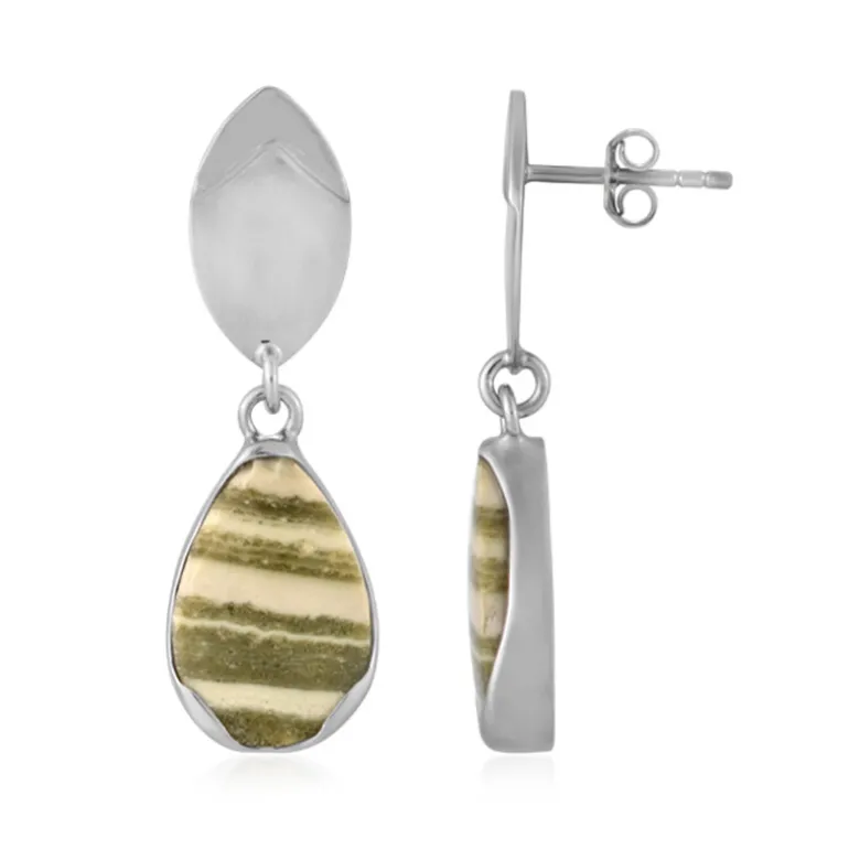 Entdecken Sie den Charme des indonesischen Zebra-Jaspis mit diesen bezaubernden Tropfen-Ohrringen. Jeder Ohrring besteht aus einem 5,5 Karat schweren, tropfenförmigen Edelstein, der elegant in platiniertes 925er Sterlingsilber eingefasst ist. Ihr einzigartiges Streifenmuster erinnert an den exotischen Geist Balis und passt sowohl zu legerer als auch zu formeller Kleidung, was sie zu einer vielseitigen Ergänzung jeder Schmucksammlung macht. Perfekt für alle, die einen Hauch von globaler Inspiration in ihren Accessoires schätzen.