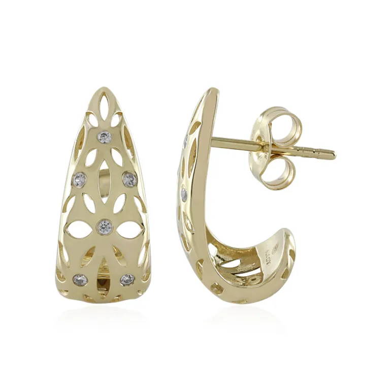 Entdecken Sie die Faszination dieser Ohrringe aus 9 Karat Gold, die mit 14 strahlenden Zirkonen aus Kambodscha von insgesamt 0,16 Karat besetzt sind. Die zarten Steine im Rundschliff sind sorgfältig in ein durchbrochenes Design gefasst, das einen Hauch von Raffinesse ausstrahlt. Mit einem Gewicht von etwa 2,15 Gramm sind diese Ohrringe ein Beweis für schlichte Eleganz. Sie eignen sich perfekt für den Tag und den Abend und passen sowohl zu einem eleganten Freizeitoutfit als auch zu formellen Anlässen und verleihen ihnen einen subtilen Glanz.