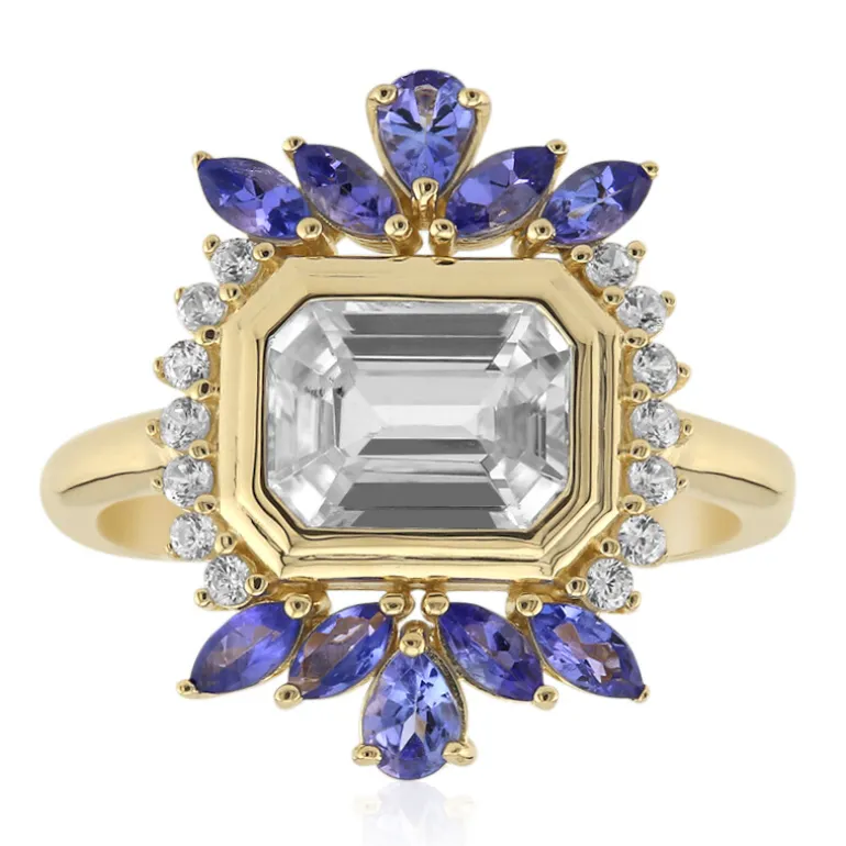 Entdecken Sie die Anziehungskraft dieses raffinierten Rings mit Zirkon und Tansanit aus Kambodscha. Der aus exquisitem 9-karätigem Gelbgold gefertigte Ring zeigt einen zentralen Zirkon im Oktagon-Schliff von 3,126 ct, flankiert von Tansaniten im Birnen- und Marquise-Schliff von insgesamt 0,950 ct. Sein satter goldener Farbton kontrastiert wunderschön mit dem tiefen Blau des Tansanits aus Tansania und macht ihn zu einem echten Blickfang. Das Gesamtgewicht des Rings beträgt 4,342 Karat und macht ihn zu einer opulenten Wahl für besondere Anlässe oder als auffällige Ergänzung für Ihre Alltagskollektion.