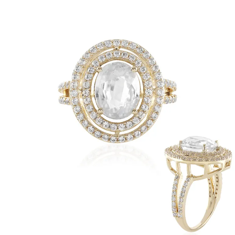 Genießen Sie den Glamour dieses Rings von Adela Gold, ein Meisterwerk mit einem atemberaubenden ovalen Zirkon im Brillantschliff aus Kambodscha von 4,01 Karat. Umgeben von einem Halo aus 96 strahlenden Zirkonen im Rundschliff mit einem Gesamtgewicht von 1,14 Karat, hat dieser exquisite Ring ein beachtliches Gesamtgewicht von 5,15 Karat. Der Ring aus leuchtendem 9-karätigem Gelbgold wiegt etwa 3,82 g und strahlt Eleganz und Raffinesse aus. Dieser Ring eignet sich perfekt für besondere Anlässe oder um Ihren alltäglichen Stil aufzuwerten und verspricht eine luxuriöse Ergänzung für jede Schmucksammlung zu sein.