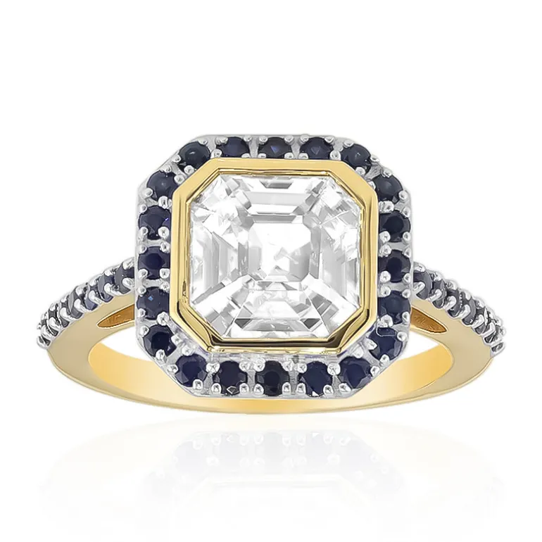 Entdecken Sie die Anziehungskraft dieses prächtigen Rings, der einen eleganten 3,183-karätigen kambodschanischen Zirkon im Achteck-Asscher-Schliff präsentiert, umrahmt von einem Halo aus 34 Madagaskar-Saphiren im Rundschliff mit einem Gesamtgewicht von 0,808 Karat. Gefertigt aus 375er Gelbgold mit einem ungefähren Metallgewicht von 3,83 g, ist dieser Ring mit seinem Kontrast aus funkelnder Klarheit und tiefblauen Farbtönen eine umwerfende Wahl für formelle Anlässe oder als bezauberndes Geschenk. Kombinieren Sie ihn mit einem klassischen Abendkleid für einen Hauch von zeitloser Anmut.