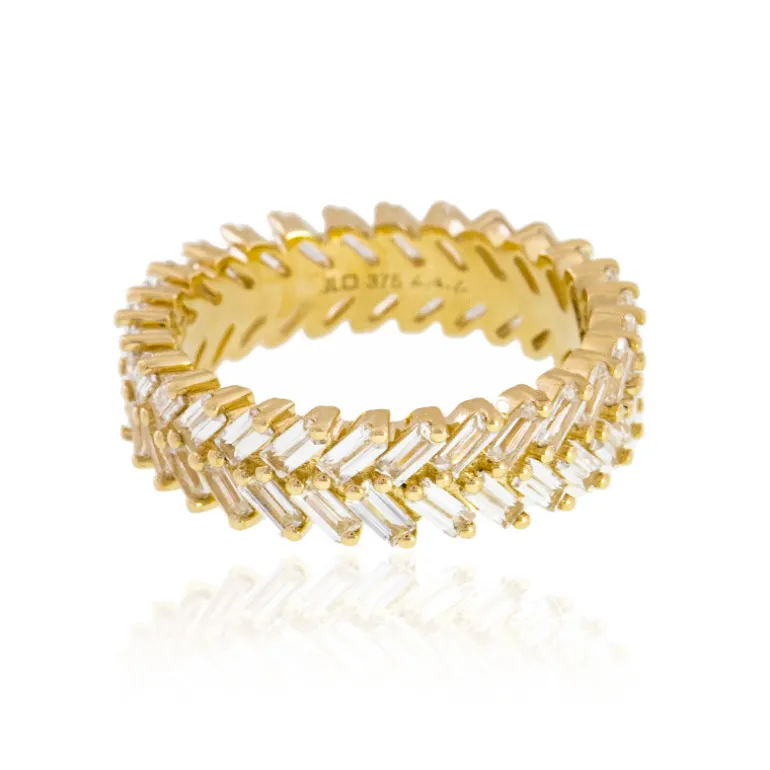 Genießen Sie den opulenten Glanz dieses bezaubernden Rings aus 9-karätigem Gold, der ein Ensemble aus kambodschanischen Zirkonen im Baguetteschliff mit insgesamt 3,175 Karat hervorhebt. Dieses exquisit gestaltete Schmuckstück zeigt ein glänzendes Band mit einem Gewicht von ca. 4,48 Gramm, das mit 56 funkelnden Zirkonen verziert ist, die so perfekt geschliffen sind, dass sie das Licht bei jeder Ihrer Bewegungen einfangen und reflektieren. Dieser Ring eignet sich perfekt, um jedem Outfit einen Hauch von Eleganz zu verleihen, und erstrahlt am hellsten bei formellen Anlässen oder raffinierten Dinners. Sein zeitloses Design macht ihn zu einem idealen Erbstück oder zu einem besonderen Geschenk für einen geliebten Menschen.