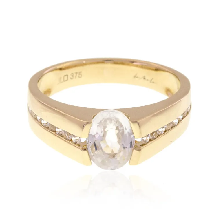 Dieser Ring aus 9-karätigem Gold ist ein luxuriöses Herzstück Ihrer Sammlung. Er verzaubert mit einem atemberaubenden Zirkon im Ovalschliff aus Kambodscha mit einem Gewicht von 1,845ct. Umrahmt von kleineren Zirkonen im Rundschliff mit einem Gesamtgewicht von 0,279 ct, glänzt der Ring mit einem Gesamtgewicht von 2,124 ct. Die warmen Farbtöne des 375er Goldbandes mit einem Gewicht von ca. 4,11 g bieten eine perfekte Bühne für das schillernde Lichtspiel der Zirkonfacetten. Als Symbol der Eleganz wird dieser Ring bei Cocktailveranstaltungen für Gesprächsstoff sorgen und Ihre Abendgarderobe umwerfend ergänzen.
