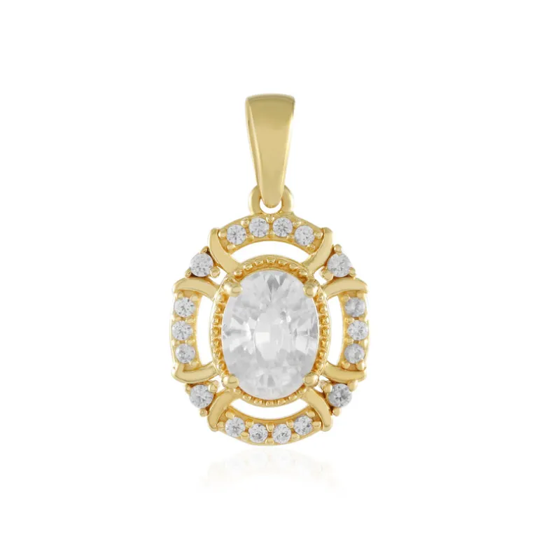 Entdecken Sie zeitlose Eleganz mit diesem vergoldeten Anhänger aus Sterlingsilber mit einem atemberaubenden ovalen Zirkon im Brillantschliff aus Kambodscha. Geschmückt mit weiteren Zirkonen im Rundschliff, bietet dieses Stück ein Gesamtgewicht von 2,224 ct. Er eignet sich perfekt für besondere Anlässe oder als eleganter Begleiter im Alltag und passt sowohl zu legeren als auch zu formellen Outfits.