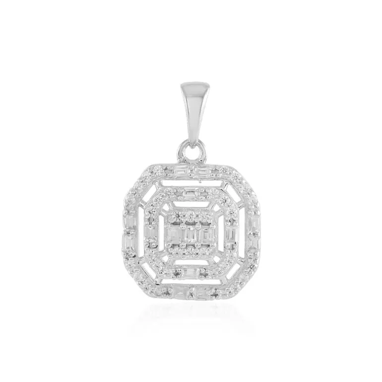 Entdecken Sie die Faszination dieses geometrischen Zirkon-Anhängers aus Kambodscha, der mit Präzision aus 925er Sterling Silber gefertigt wurde. Mit 15 Zirkonen im Baguetteschliff und 34 Zirkonen im Rundschliff mit insgesamt 1,012 Karat strahlt dieser Anhänger ein modernes, elegantes Design aus. Jeder einzelne Edelstein, der sorgfältig nach seiner Klarheit und seinem Glanz ausgewählt wurde, ist so gefasst, dass er ein schillerndes Lichtspiel erzeugt. Dieser Anhänger ist ideal, um jedem Outfit einen Hauch von Raffinesse zu verleihen und kann sowohl Freizeitlooks ergänzen als auch Abendgarderobe aufwerten. Setzen Sie ein Zeichen oder verschenken Sie ihn an einen besonderen Menschen, um einen unvergesslichen Akzent zu setzen.