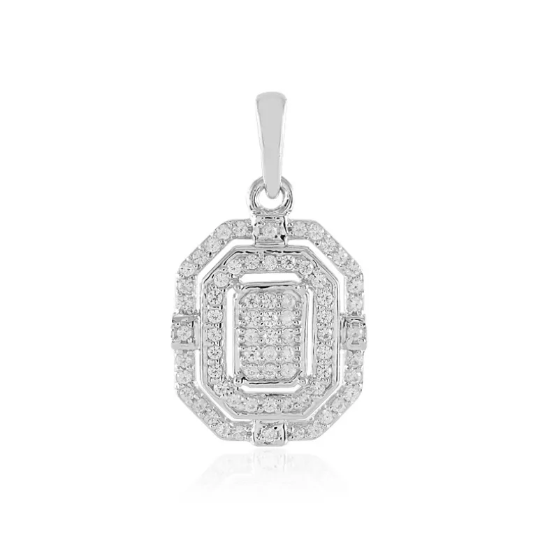 Dieser mit Präzision gefertigte Anhänger aus Sterlingsilber glänzt mit 71 kambodschanischen Zirkonen im Rundschliff von insgesamt 0,576 Karat. Die geometrischen Linien und das luxuriöse Funkeln strahlen eine zeitgenössische Eleganz aus, die sich perfekt für ein modernes Styling eignet. Mit einer Größe von 25 x 14 mm zieht dieser Anhänger die Blicke auf sich, ohne Ihr Ensemble zu erdrücken, was ihn zu einer vielseitigen Wahl für Tages- und Abendgarderobe macht. Ideal, um sowohl der Büro- als auch der Abendgarderobe einen Hauch von Glamour zu verleihen.