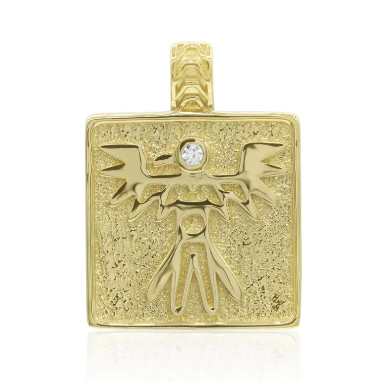 Dieser atemberaubende Anhänger präsentiert einen einzelnen 0,04-karätigen kambodschanischen Zirkon, der in einen vergoldeten 925er Sterlingsilberblock gefasst ist. Der strahlende Zirkon im Rundschliff in der Mitte verleiht dem vom Stamm inspirierten Emblem eine funkelnde Note und bildet einen verführerischen Kontrast zum strukturierten Goldhintergrund. Mit seinen Abmessungen von 26×19 mm ist dieser Anhänger ein subtiles und zugleich raffiniertes Statement. Er eignet sich sowohl für die Freizeit als auch für besondere Anlässe und lässt sich wunderbar mit einer einfachen Kette kombinieren.