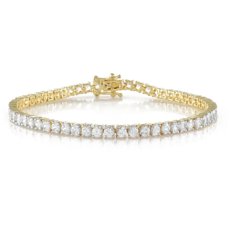 Dieses atemberaubende Armband besteht aus 55 runden Zirkonen aus Kambodscha mit einem Gesamtgewicht von 7,263 Karat, die in elegant vergoldetes 925er Sterlingsilber gefasst sind. Dieses Armband eignet sich perfekt, um jedem Ensemble einen Hauch von Raffinesse zu verleihen, und ist sowohl für formelle Anlässe als auch für die Eleganz des Alltags geeignet. Kombinieren Sie es mit einem schicken Kleid zum Ausgehen oder ergänzen Sie Ihr Büro-Outfit für einen eleganten Look.