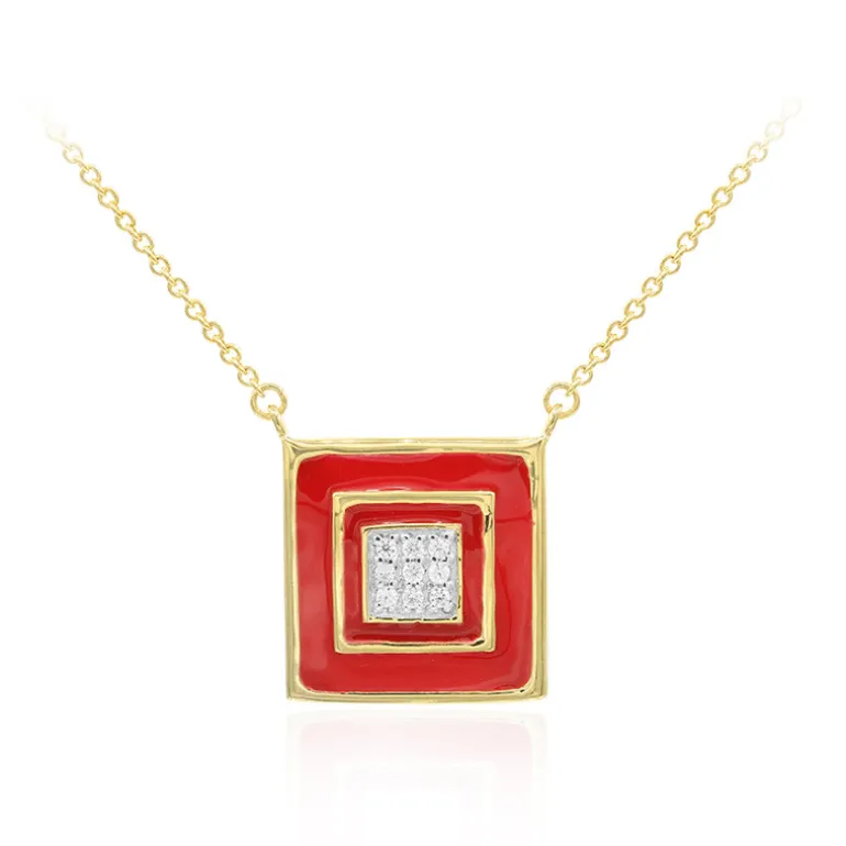 Entdecken Sie die Faszination dieser schicken Kette aus vergoldetem 925er Sterling Silber, die eine Konstellation aus neun Zirkonen im Rundschliff aus Kambodscha mit einem Gesamtkaratgewicht von 0,099 Karat präsentiert. Der quadratische Anhänger, der ein reizvolles konzentrisches Design mit einem roten Emaille-Akzent aufweist, sitzt perfekt in der Mitte einer 45,5 cm langen Kette. Diese Halskette ist ideal, um jedem Outfit einen farbigen und eleganten Akzent zu verleihen. Sie ist ein vielseitiges Schmuckstück für legere und formelle Anlässe.