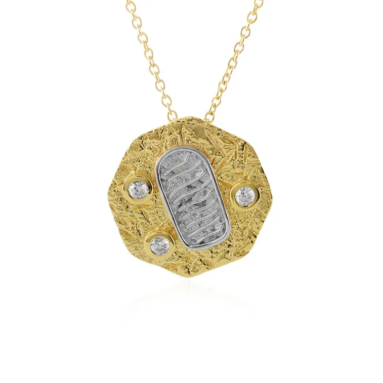 Entdecken Sie die Anziehungskraft dieser exquisiten Halskette mit drei kambodschanischen Zirkonen im Rundschliff von insgesamt 0,135 Karat, die kunstvoll in strukturiertes 925er Sterlingsilber mit reicher Goldplattierung gefasst sind. Jeder Zirkon funkelt brillant und verleiht dem organisch geformten Anhänger, der an einer 45,5 cm langen Kette hängt, einen Hauch von Eleganz. Als vielseitiges Statement-Piece wertet diese Halskette sowohl legere als auch formelle Outfits auf und ist somit eine unverzichtbare Ergänzung Ihrer Schmucksammlung.
