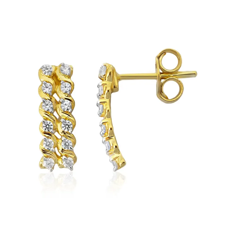 Entdecken Sie die Anziehungskraft dieser schicken Ohrringe aus vergoldetem Sterlingsilber, die mit einer Reihe strahlender kambodschanischer Zirkone von insgesamt 0,477 Karat verziert sind. Jeder Zirkon ist meisterhaft geschliffen, um seine Brillanz gegenüber den warmen Goldtönen zu betonen. Mit einem leichten Gewicht von 1,75 Gramm und einer Länge von 15 mm verleihen diese Ohrringe sowohl Tages- als auch Abend-Outfits Eleganz. Perfekt für alle, die feine Handwerkskunst und den Glamour von Gold zu schätzen wissen.