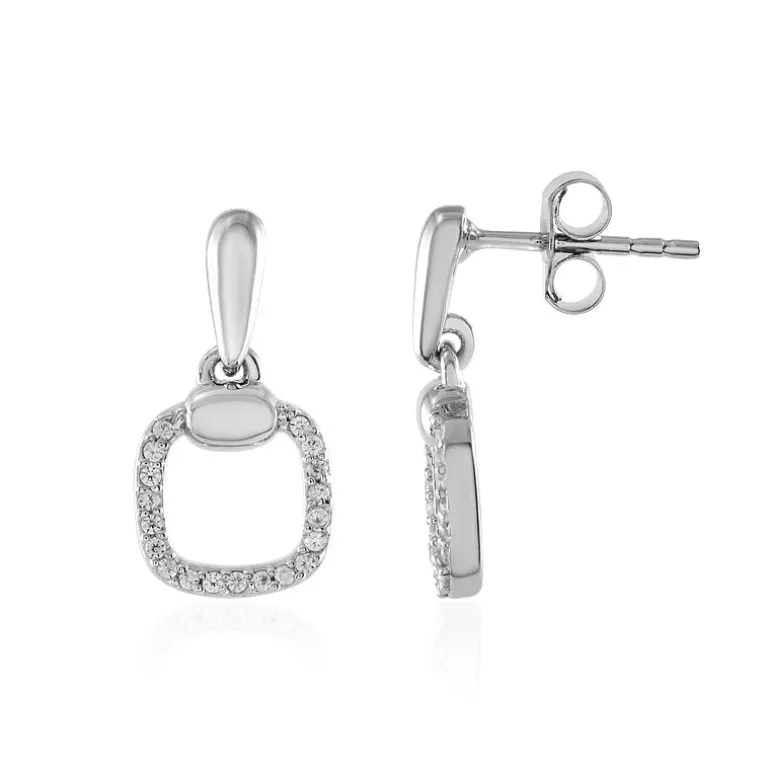 Entdecken Sie die Anziehungskraft unserer glänzenden Silberohrringe mit kambodschanischem Zirkon, ein Paar, das Raffinesse ausstrahlt. Jeder Ohrring ist sorgfältig mit einem runden Zirkon von insgesamt 0,273 Karat besetzt, der fachmännisch aus platiniertem 925er Sterlingsilber gefertigt wurde. Diese schicken quadratischen Tropfenohrringe mit einem Gewicht von ca. 2,37 g funkeln mit einer zeitlosen Eleganz, die fasziniert. Sie eignen sich sowohl für einen legeren Brunch als auch für formelle Abendveranstaltungen und verleihen jedem Outfit einen Hauch von Luxus.