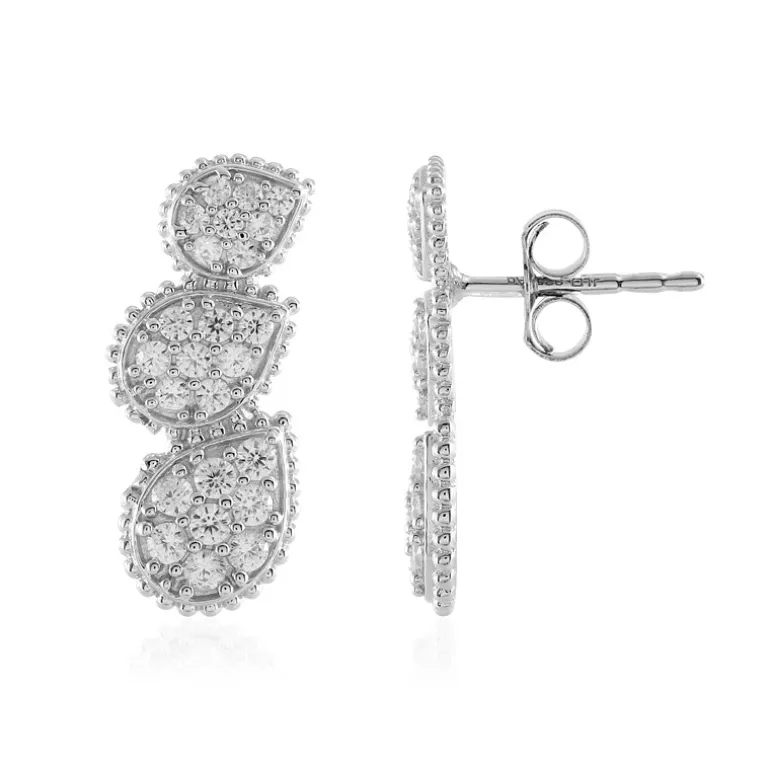Diese atemberaubenden Ohrringe zeigen das Funkeln des kambodschanischen Zirkons, der mit seinen schönen Facetten das Licht bei jeder Bewegung reflektiert. Gefertigt aus hochwertigem 925er Sterlingsilber und veredelt mit einer luxuriösen Platinbeschichtung, bieten sie sowohl Haltbarkeit als auch Raffinesse. Das dreistufige Design strahlt eine zeitlose Eleganz aus und macht sie zu einer vielseitigen Wahl sowohl für den Charme am Tag als auch für den Glamour am Abend. Diese Ohrringe sind perfekt, um jedem Ensemble einen Hauch von Brillanz zu verleihen. Sie sind ein Beweis für klassischen Stil gepaart mit moderner Handwerkskunst.