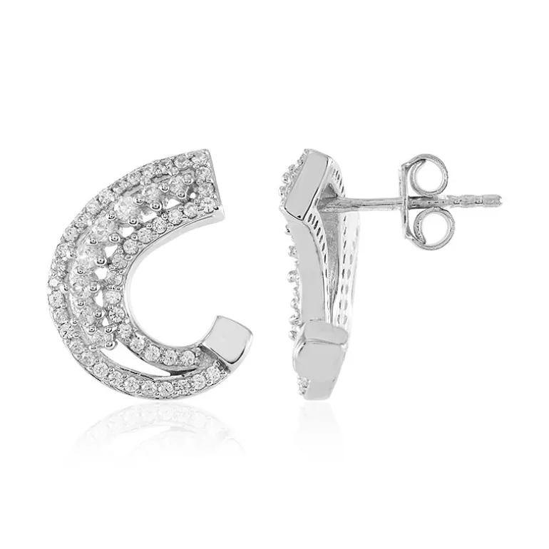 Entdecken Sie den strahlenden Charme dieser Ohrringe aus Sterlingsilber, die mit einer Konstellation aus 102 kambodschanischen Zirkonen von insgesamt 1,125 Karat geschmückt sind. Die Präzision der rund geschliffenen Edelsteine fängt das Licht ein und reflektiert es für einen auffälligen Schimmer. Mit einem Gewicht von ca. 4,45 Gramm sind diese 18 mm großen Ohrringe perfekt geeignet, um sowohl der Tages- als auch der Abendgarderobe einen Hauch von Raffinesse zu verleihen. Sie sind ideal für die moderne Frau und vereinen zeitlose Eleganz mit einem modernen Halbmond-Design.