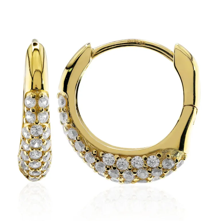 Verleihen Sie Ihrem Ensemble einen Hauch von Glamour mit diesen atemberaubenden Creolen aus vergoldetem 925er Sterlingsilber, die mit einer beeindruckenden Reihe von 82 Zirkonen im Rundschliff aus Tansania mit insgesamt 1,697 Karat besetzt sind. Diese 17 mm großen Creolen funkeln bei jeder Drehung und sind ein vielseitiges Accessoire für den Tag und den Abend. Kombinieren Sie sie mit einer eleganten Hochsteckfrisur zum Ausgehen oder mit Ihrer Berufskleidung für einen glänzenden Bürolook.