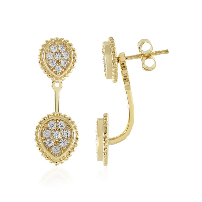 Entdecken Sie die zeitlose Eleganz dieser Ohrringe aus vergoldetem 925er Sterlingsilber, die mit 0,836 Karat glitzernden kambodschanischen Zirkonen besetzt sind. Jeder Ohrring hat ein zartes Tropfendesign mit 32 runden Zirkonen im Brillantschliff, die Ihrem Outfit einen Hauch von Glanz verleihen. Die raffinierte Silhouette, die sich über 27 mm erstreckt, sorgt für eine anmutige Bewegung, die Ihre Gesichtszüge bei jeder Neigung des Kopfes akzentuiert. Diese exquisiten Schmuckstücke eignen sich perfekt, um sowohl der Tages- als auch der Abendgarderobe ein raffiniertes Funkeln zu verleihen, was sie zu einer vielseitigen Ergänzung Ihrer Schmucksammlung macht.