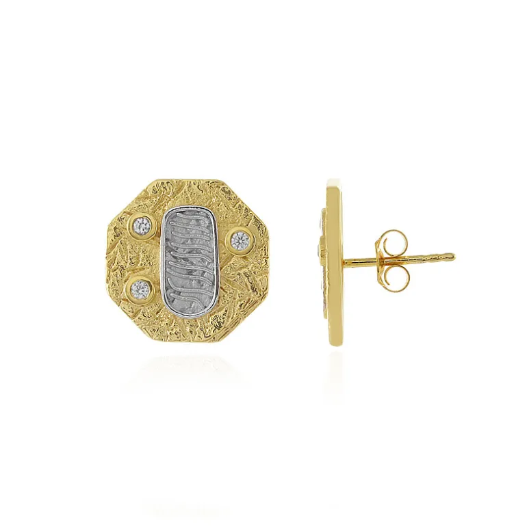 Entdecken Sie die Faszination dieser achteckigen Ohrstecker, die aus 925er Sterlingsilber mit einer luxuriösen Goldauflage gefertigt sind. Jedes Stück ist mit sechs kambodschanischen Zirkonen im Rundschliff von insgesamt 0,189 Karat besetzt, die elegant das Licht einfangen und bei jeder Bewegung schimmern. Mit einem Gewicht von ca. 5,07 Gramm verbinden diese Ohrringe die zeitlose Anziehungskraft von klassischem Edelsteinschmuck mit modernem Design. Diese Ohrringe eignen sich perfekt, um Ihrer Alltagskleidung einen Hauch von Raffinesse zu verleihen oder ein Abendensemble zu vervollständigen. Sie sind eine vielseitige Ergänzung Ihrer Sammlung.