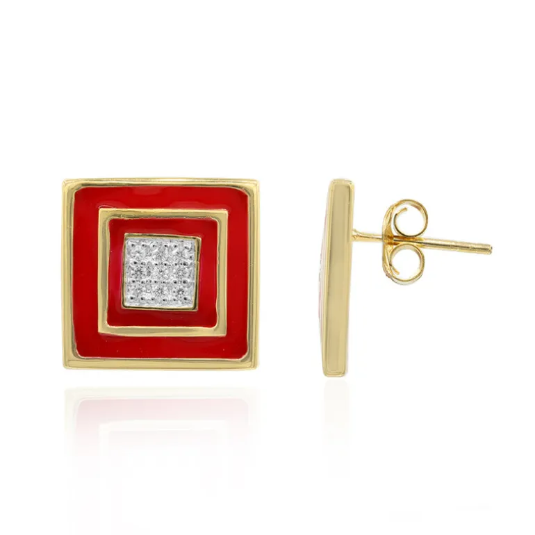 Wir präsentieren unsere auffälligen vergoldeten Silberohrringe, die mit einem exquisiten Ensemble aus 18 kambodschanischen Zirkonen im Rundschliff von insgesamt 0,207 Karat geschmückt sind. Diese 15 mm großen Ohrringe sind aus hochwertigem 925er Sterlingsilber gefertigt und zeichnen sich durch ein modernes geometrisches Design mit einer leuchtend roten Einlage aus, die einen starken Kontrast zum strahlenden Zirkon in der Mitte bildet. Perfekt, um jedem Outfit einen Hauch von Farbe und Raffinesse zu verleihen. Diese Ohrringe sind ideal für legere und formelle Anlässe.