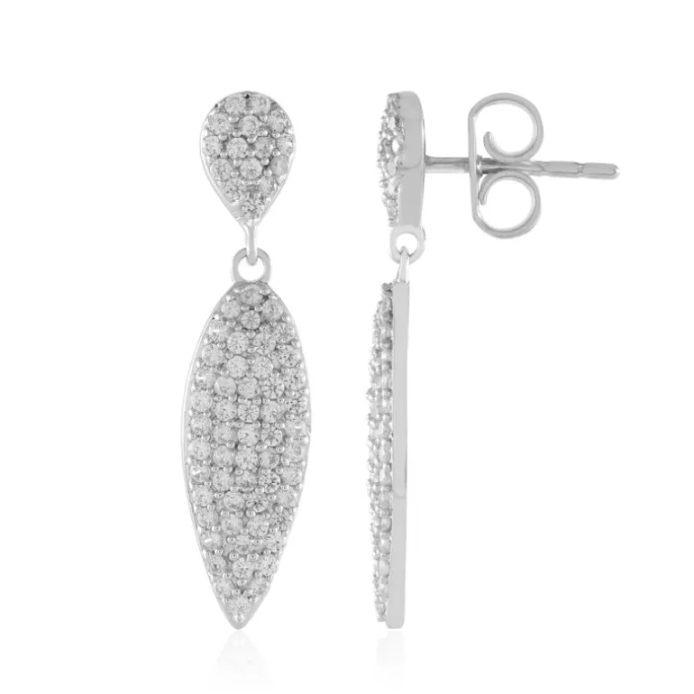 Diese atemberaubenden Zirkon-Sterlingsilber-Ohrringe sind mit 132 kambodschanischen Zirkonen von insgesamt 1,683 Karat sorgfältig verarbeitet. Die rund geschliffenen Steine, die in eleganten 31 mm großen Tropfen gefasst sind, erzeugen einen schimmernden Effekt, der sich sowohl für formelle als auch für legere Anlässe eignet. Kombinieren Sie sie mit einem Abendkleid für einen raffinierten Look oder tragen Sie sie mit einer Bluse für einen Hauch von Funkeln in Ihrer täglichen Kleidung.