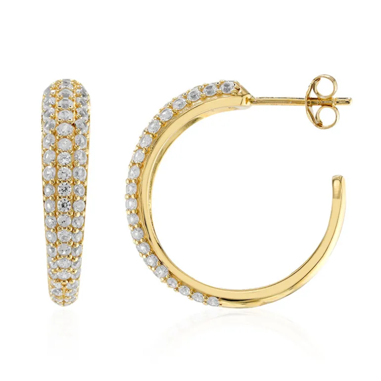 Entdecken Sie die Faszination dieser vergoldeten Silberohrringe, die mit insgesamt 2,675 Karat funkelnden Zirkonen im Rundschliff aus Tansania besetzt sind. Jeder Zirkon, der ca. 1,7 mm und 1,5 mm groß ist, wurde sorgfältig gefasst, um ein nahtloses Meer aus Brillanz auf dem 25 mm großen Ring zu schaffen. Die Basis aus 925er Sterlingsilber garantiert Langlebigkeit, während die luxuriöse Vergoldung einen Hauch von königlicher Eleganz verleiht. Sie eignen sich sowohl für legere als auch für formelle Anlässe und werten jedes Outfit mühelos auf. Eine unverzichtbare Ergänzung für jede Schmucksammlung.