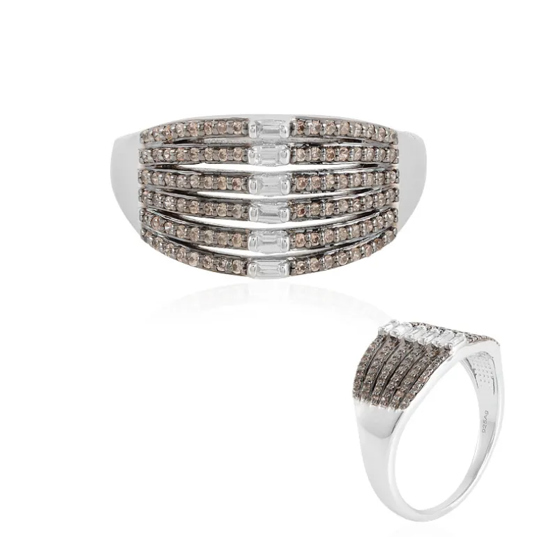 Tauchen Sie ein in die Pracht dieses atemberaubenden Rings, der insgesamt 0,99 Karat kambodschanischer Zirkone präsentiert. Das Design besteht aus sechs Zirkonen im Baguetteschliff, die von 96 cognacfarbenen Zirkonen im Rundschliff ergänzt werden, die alle präzise in poliertes 925er Sterlingsilber gefasst sind. Die brillante Anordnung der Steine und die beachtliche Größe des Rings von 20×19 mm machen ihn zu einem herausragenden Schmuckstück für Abendveranstaltungen oder als schillernde Ergänzung zu Ihrer Bürokleidung. Das Gewicht des Silbers von ca. 5,05 g verleiht diesem exquisiten Accessoire ein angenehmes und zugleich luxuriöses Gewicht.