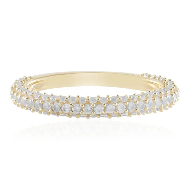 Dieser atemberaubende Ring besteht aus insgesamt 103 kambodschanischen Zirkonen im Rundschliff, die zart in ein wunderschönes vergoldetes 925er Sterlingsilberband eingelegt sind. Mit einem Gesamtgewicht von 1,053 Karat unterstreichen die präzisen Schliffe der Zirkone ihre natürliche Brillanz. Dieses Schmuckstück ist ideal, um dem Alltag einen Hauch von Glamour zu verleihen oder ein raffiniertes Abendensemble zu vervollständigen. Es stellt die Schnittstelle zwischen Luxus und Vielseitigkeit dar.