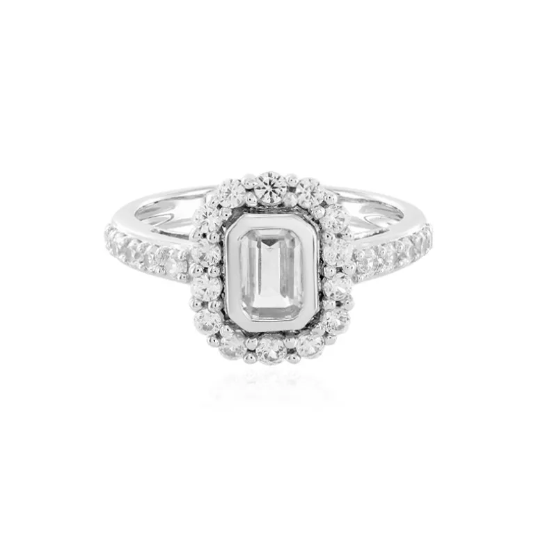 Dieser strahlende Ring aus Sterlingsilber ist mit einer Kollektion kambodschanischer Zirkonsteine von insgesamt 1,75 Karat besetzt und bietet eine moderne Variante des klassischen Halo-Designs. Der zentrale Zirkon im Achteckschliff wird von einer Reihe schimmernder Steine im Rundschliff flankiert, die alle sorgfältig gefasst sind, um das Funkeln zu verstärken. Das zeitlose Schmuckstück wiegt ca. 2,85 Gramm und ist die perfekte Wahl, um sowohl im Alltag als auch bei besonderen Anlässen einen Hauch von Eleganz zu vermitteln. Kombinieren Sie ihn mit eleganter Abendgarderobe für einen raffinierten Auftritt.