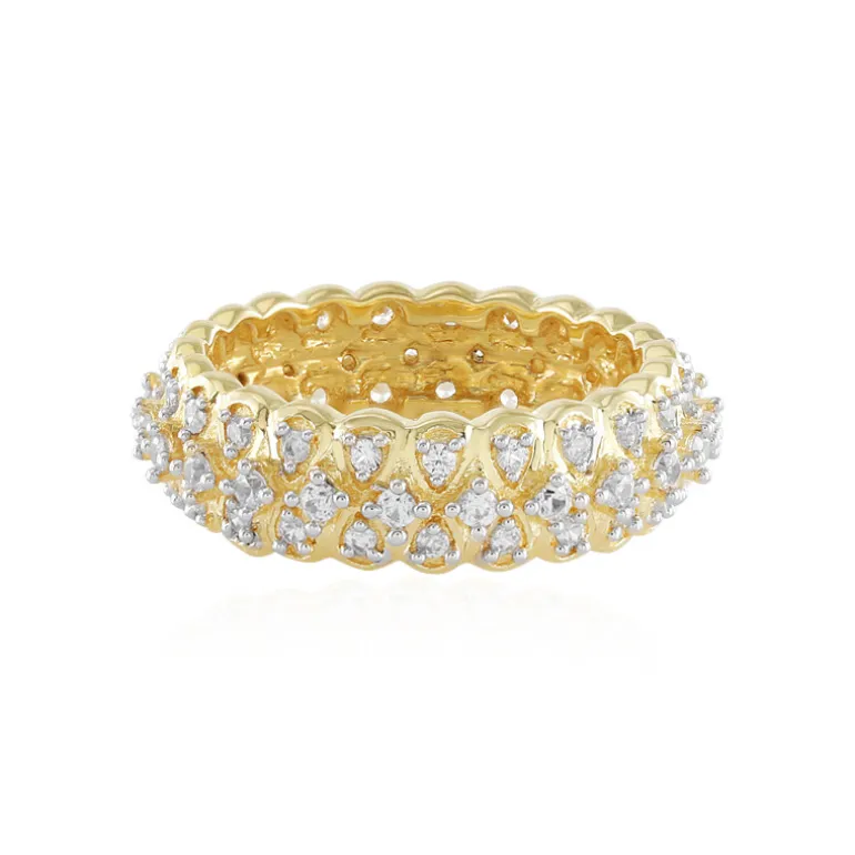 Dieser funkelnde Ring präsentiert eine atemberaubende Reihe von 69 kambodschanischen Zirkonen mit einem Gesamtgewicht von mindestens 0,927 Karat. Jeder Edelstein wurde sorgfältig geschliffen, misst zwischen 1,3 und 1,5 mm und ist in glänzendes 925er Sterlingsilber mit einer Goldauflage von mindestens 3,85 Gramm eingefasst. Das 22×22 mm große Design bietet einen luxuriösen Look, der sowohl glamourös als auch vielseitig ist – perfekt, um Tagesoutfits aufzuwerten oder der Abendgarderobe einen Hauch von Glanz zu verleihen.