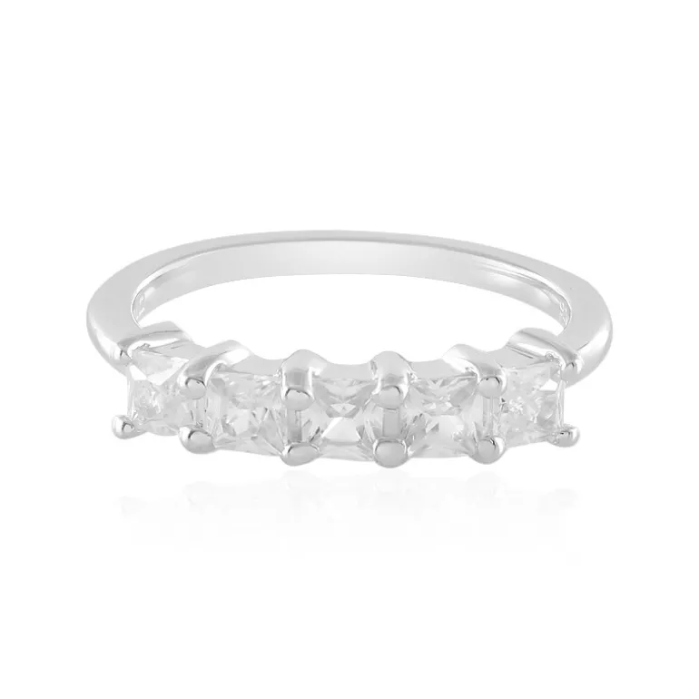 Dieser anmutige und zeitlose Ring aus Sterlingsilber besteht aus fünf schimmernden Zirkonen aus Kambodscha mit einem Gesamtgewicht von 0,972 Karat. Jeder Zirkon ist meisterhaft in eine quadratische Prinzessform geschliffen, die jeweils etwa 3 mm groß ist und das Licht wunderschön reflektiert. Das Band aus 925er Sterlingsilber mit einem Gewicht von etwa 1,6 Gramm ergänzt die funkelnden Zirkone mit seinem glänzenden Finish. Dieser Ring ist ideal für den eleganten Alltag oder als schimmernde Ergänzung zur Abendgarderobe. Er ist ein vielseitiges Stück für jede Schmucksammlung.