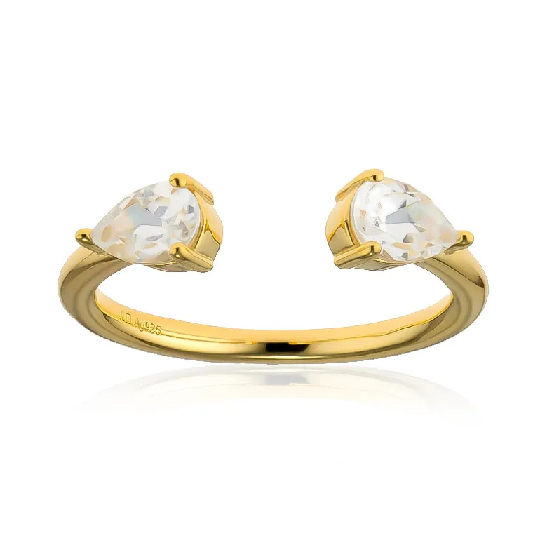 Dieser moderne und schicke Ring im offenen Stil besteht aus zwei schillernden kambodschanischen Zirkonen im Tropfenschliff mit einem Gesamtgewicht von 1,044 Karat, die elegant in 925er Sterlingsilber mit einer satten Goldplattierung gefasst sind. Das trendige Design und die glänzende Oberfläche machen diesen Ring zu einem vielseitigen Accessoire für legere und formelle Anlässe und verleihen Ihrem Outfit einen Hauch von Raffinesse.