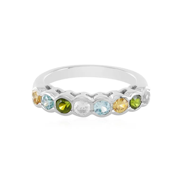 Entdecken Sie eine Sinfonie der Farben mit diesem atemberaubenden Ring aus Sterlingsilber, der eine Reihe glänzender Zirkone aus Kambodscha enthält. Jeder der sorgfältig auf etwa 3 mm rund geschliffenen Steine hat insgesamt 1,305 Karat und bietet ein schillerndes Spektrum von satten Grüntönen bis hin zu strahlendem Gelb. Das platinierte Silber bietet eine haltbare und elegante Grundlage, die die lebhaften Farbtöne ergänzt. Dieser Ring eignet sich perfekt für den Alltag oder für besondere Anlässe und passt sowohl zu legeren als auch zu formellen Anlässen. Lassen Sie sich von dem lebendigen Charme dieses farbenfrohen Schmuckstücks verzaubern.