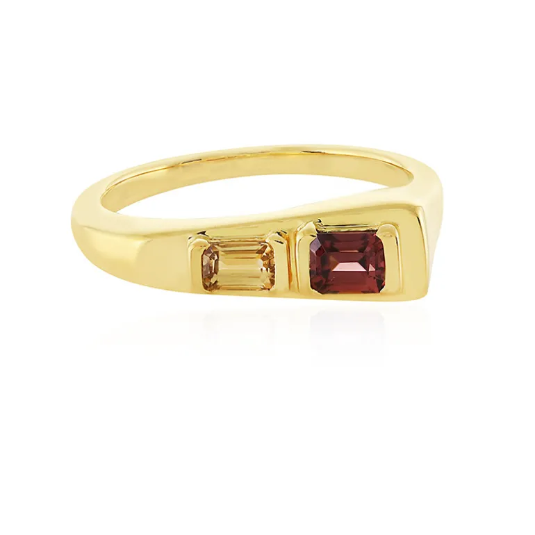 Entdecken Sie die luxuriöse Wärme dieses exquisiten Rings aus der MONOSONO COLLECTION, der ein bezauberndes Zirkon-Duo präsentiert. Ein mahagonifarbener Zirkon von 0,722 Karat aus Kambodscha paart sich elegant mit einem goldenen Zirkon von 0,449 Karat aus Tansania, beide im faszinierenden Achteck-Schliff, gefasst in 925er Sterlingsilber mit einer aufwendigen Goldplattierung. Die prächtigen Farbtöne und das Gesamtgewicht des Edelsteins von 1,171 Karat machen dieses Schmuckstück zu einer opulenten Ergänzung für jedes Ensemble, das Selbstvertrauen für ein hochkarätiges Meeting oder einen Hauch von Raffinesse für eine Abendveranstaltung suggeriert.