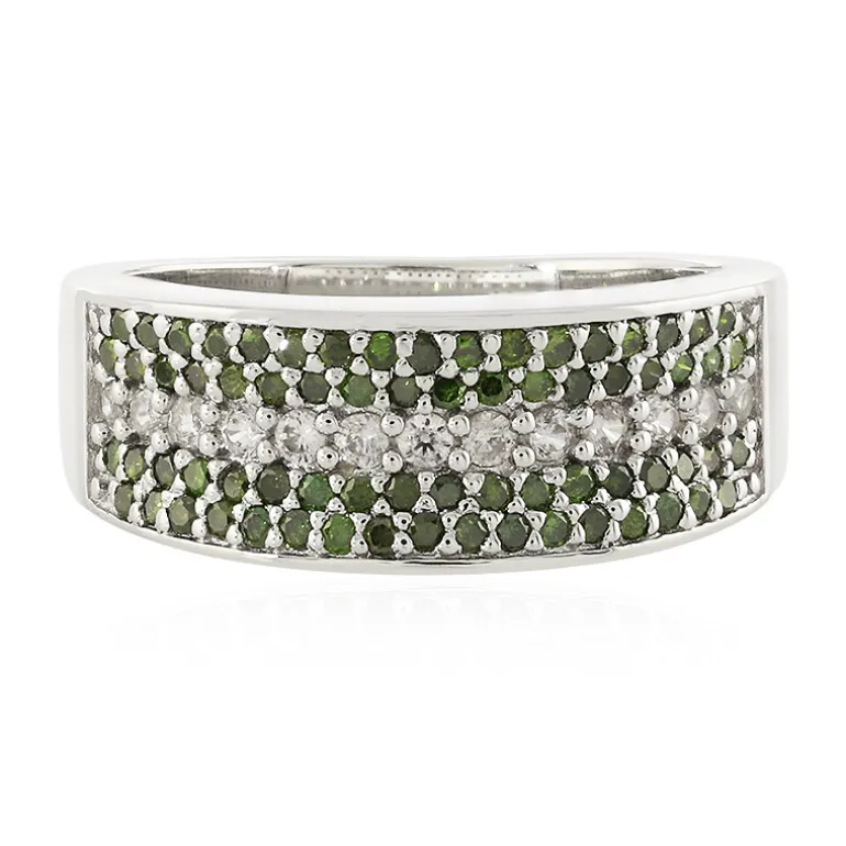 Tauchen Sie ein in die funkelnde Anziehungskraft dieses Rings aus Sterlingsilber, gekrönt von 13 kambodschanischen Zirkonen im Rundschliff und 70 grün schimmernden Diamanten mit insgesamt 0,656 Karat. Sein schlankes Design mit den Maßen 21×20 mm wird durch die Basis aus 925er Sterlingsilber mit einem Gewicht von ca. 4,16 Gramm noch verstärkt. Dieses kunstvoll gemusterte Schmuckstück ist ideal, um sowohl bei Tag als auch bei Nacht einen Hauch von Eleganz zu verleihen. Es reflektiert das Licht wunderschön und sorgt dafür, dass Sie bei jeder Gelegenheit auffallen.