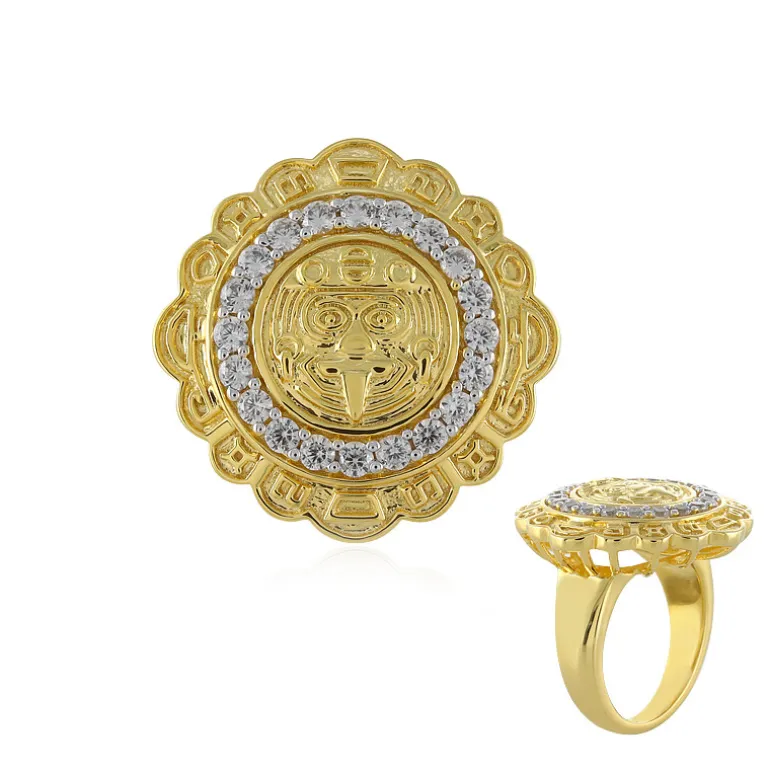 Entdecken Sie die perfekte Mischung aus Tradition und Glanz mit unserem kambodschanischen Zirkonring aus vergoldetem Silber. Dieses außergewöhnliche Schmuckstück besteht aus 20 runden Zirkonen von insgesamt 0,324 Karat, die in einem von der Sonne inspirierten Muster auf einem Band aus 925er Sterlingsilber gefasst sind, das aufwendig vergoldet wurde. Der 23×23 mm große Ring wiegt etwa 9,37 g und strahlt Eleganz aus. Er ist ideal für kulturelle Anlässe oder als opulentes Accessoire für den Alltag. Dieser Ring wird seine Bewunderer garantiert verzaubern und begeistern.