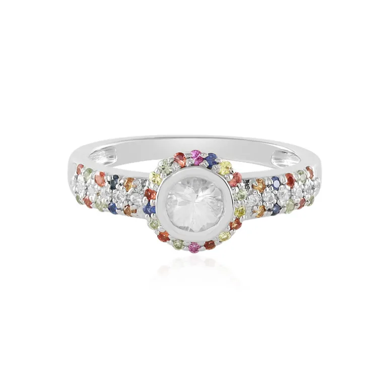 Entdecken Sie das lebendige Fest der Farben mit diesem Ring aus Sterlingsilber, in dessen Mitte ein kambodschanischer Zirkon von 0,623 ct im Brillantschliff für maximalen Glanz sorgt. Um das Herzstück herum bilden 38 rundgeschliffene Madagaskar-Saphire und 12 weitere kambodschanische Zirkone von insgesamt 0,386 ct bzw. 0,056 ct einen regenbogenfarbenen Halo. Das platinierte 925er Silberband bietet Langlebigkeit und ein elegantes Finish. Dieser Ring ist ein ideales Accessoire, um jedem Outfit einen Farbakzent zu verleihen, und perfekt für alle, die einen Hauch von Skurrilität in ihrer Schmucksammlung schätzen.