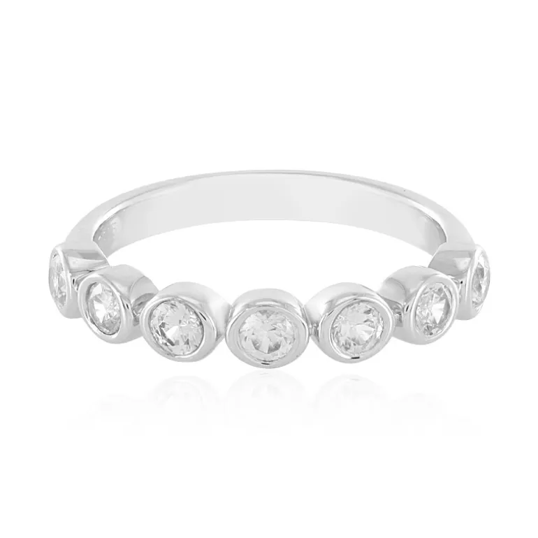 Lassen Sie Ihre Hand mit diesem Ring aus 925er Sterlingsilber erstrahlen, der eine Reihe von sieben kambodschanischen Zirkonen im Rundschliff mit insgesamt 0,63 Karat aufweist. Jeder Edelstein ist gleichmäßig verteilt und strahlt Klarheit und Glanz aus, die das Auge anziehen. Das schlichte Silberband ergänzt die Brillanz der Zirkone und macht den Ring sowohl für den Alltag als auch für besondere Anlässe perfekt. Kombinieren Sie diesen zeitlosen Ring mit jedem Outfit für einen sofortigen Hauch von Eleganz.