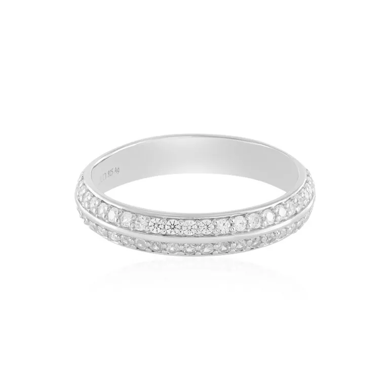 Entdecken Sie das Strahlen des kambodschanischen Zirkons mit diesem fein gearbeiteten Ring, der 48 Zirkone im Rundschliff mit einem Gesamtkaratgewicht von 0,958 Karat enthält. Jeder der sorgfältig gefassten Steine auf dem platinierten 925er Sterlingsilberband reflektiert das Licht wunderschön und erzeugt einen schillernden Effekt, der an Sternenlicht erinnert. Mit einem Gewicht von ca. 2,77 g bietet dieser Ring ein ausgewogenes Verhältnis zwischen Eleganz und Tragekomfort und eignet sich daher perfekt für das tägliche Tragen oder besondere Abende. Sein vielseitiges Design passt sowohl zu legeren als auch zu formelleren Outfits und macht ihn zu einem unverzichtbaren Teil Ihrer Schmucksammlung.