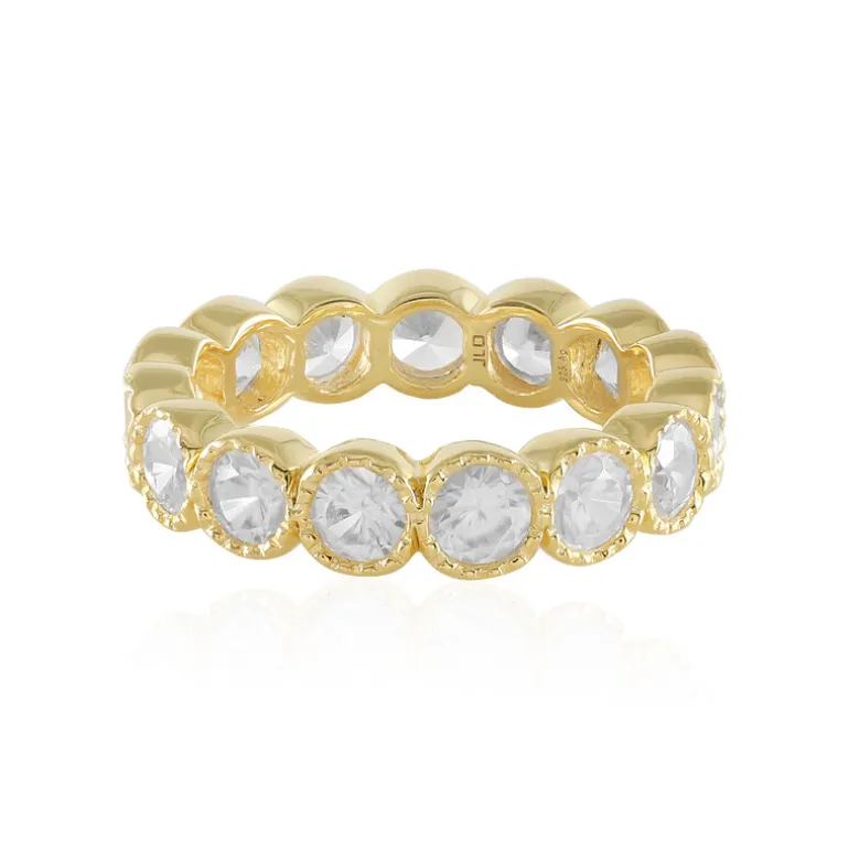 Entdecken Sie die Anziehungskraft dieses bezaubernden Rings aus vergoldetem Silber, der ein durchgehendes Band aus schimmernden Zirkonsteinen aufweist. Jeder Stein ist sorgfältig in eine robuste, vergoldete Fassung gefasst und strahlt zeitlose Eleganz aus. Er eignet sich sowohl für lässige Ausflüge als auch für elegante Abende und ist eine vielseitige Ergänzung für jede Schmucksammlung. Lassen Sie dieses Schmuckstück den letzten Schliff für Ihr Ensemble sein und verleihen Sie Ihrem Alltagsstil einen Hauch von Glamour.