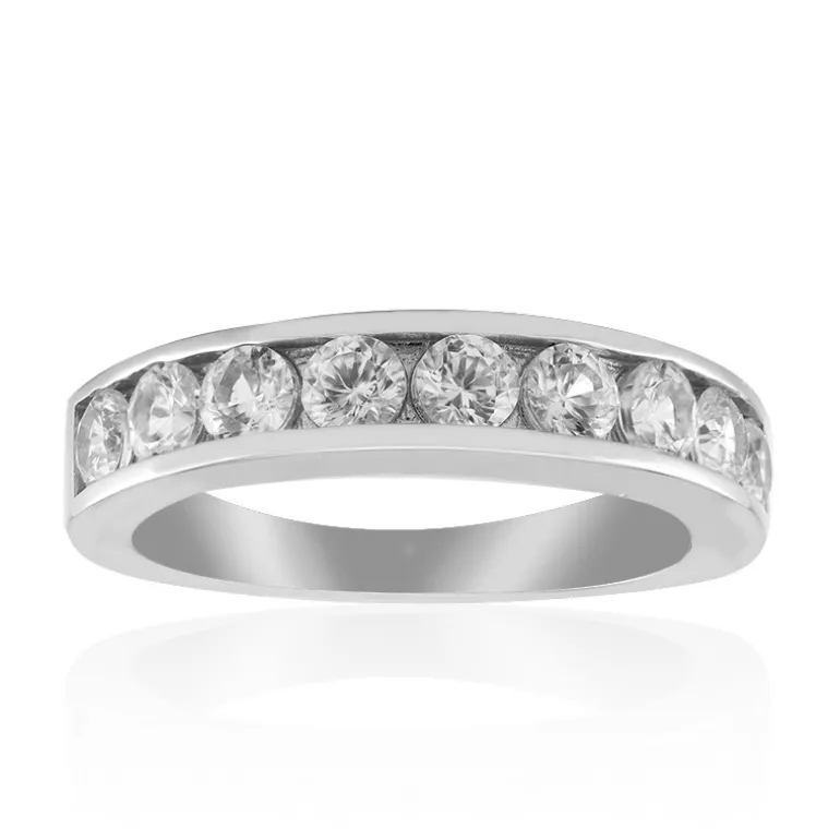 Dieser prächtige Ring präsentiert neun kambodschanische Zirkone im Rundschliff mit einem Gesamtkaratgewicht von 1,342 ct, die elegant in platiniertes 925er Sterlingsilber gefasst sind. Das schlanke Band, das vom Glanz der Zirkone erhellt wird, bietet einen raffinierten Stil, der sich sowohl für den eleganten Alltag als auch für besondere Anlässe eignet. Dieses Schmuckstück ist ideal für alle, die die feinen Details meisterhafter Handwerkskunst zu schätzen wissen, und lässt sich wunderbar mit einem eleganten Abendkleid oder einem schicken Freizeitoutfit kombinieren.